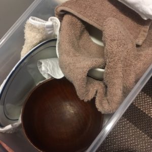 なので、引っ越しにあたっては食器の間にハンカチやタオルなどの布類を詰めまして、引き出しの中をギュウギュウにしておきます。